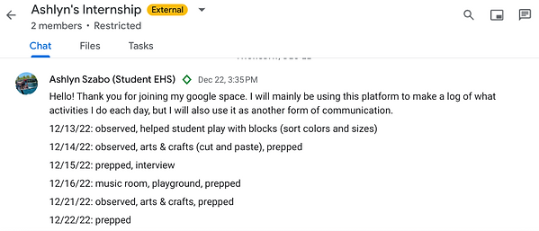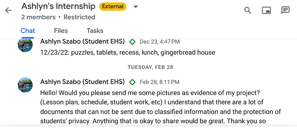 I was fortunate enough to be able to communicate with my mentor face-to-face. We scheduled our meetings in person, so we didn't have much online communication. Below are the few times I communicated with her online.